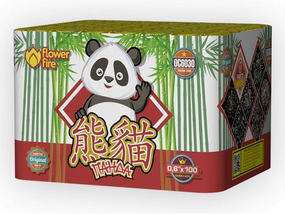 Эффект (основной): Умеренная интенсивность стрельбы (каждый 6-й заряд). Несмотря на небольшой калибр, 100 зарядов в таком темпе создадут продолжительное шоу. Ожидаются преимущественно черные, белые и, возможно, зеленые эффекты (в соответствии с символикой панды), с быстрой сменой мелких искр.