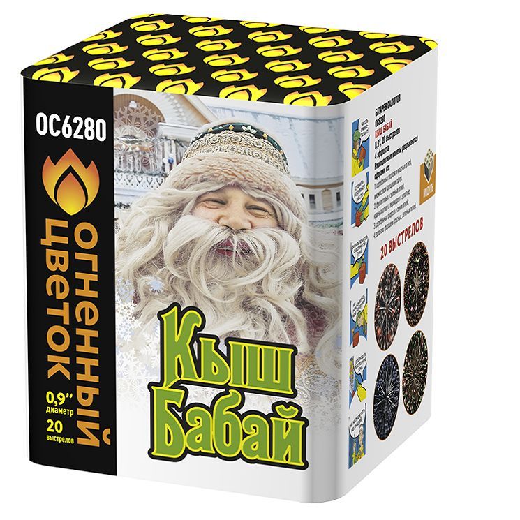 Салют “Кыш Бабай” (Дед Мороз) — это повторение волшебной зимней сказки в компактном формате! 20 зарядов калибра 0,8 дюйма, запускаемые с очень медленной скоростью (каждый 12-й заряд), обеспечат редкие, но заметные и красивые эффекты!