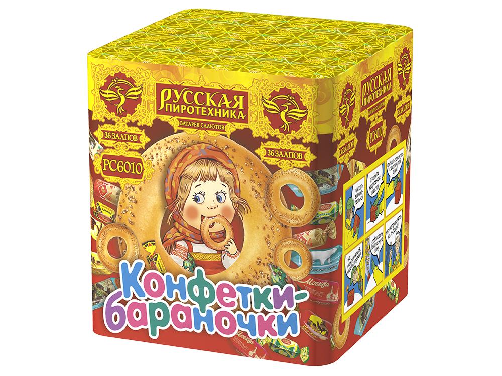 «Конфетки-бараночки» — это продолжительный, веселый и красочный салют. Благодаря большому количеству залпов при малом калибре, он идеально подходит для создания длительного, но уютного и радостного настроения, ассоциирующегося с традиционными сладостями.