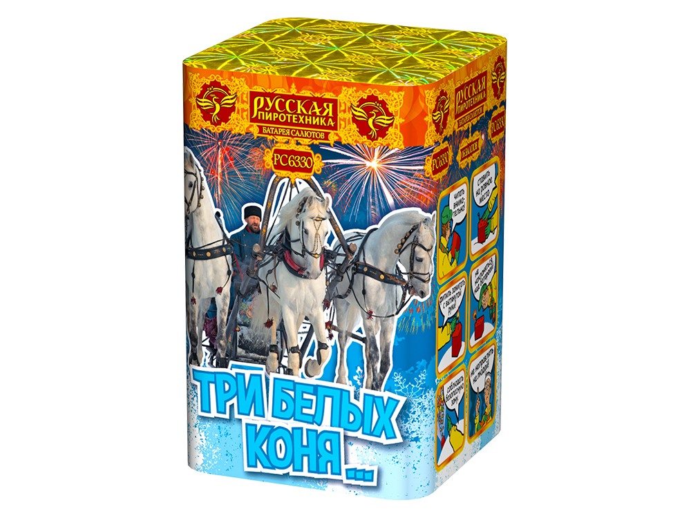 «Три белых коня» (РС6330) — это салют среднего размера, названный в честь знаменитой новогодней песни. Он идеально подходит для зимних торжеств, создавая атмосферу волшебства и скорости.