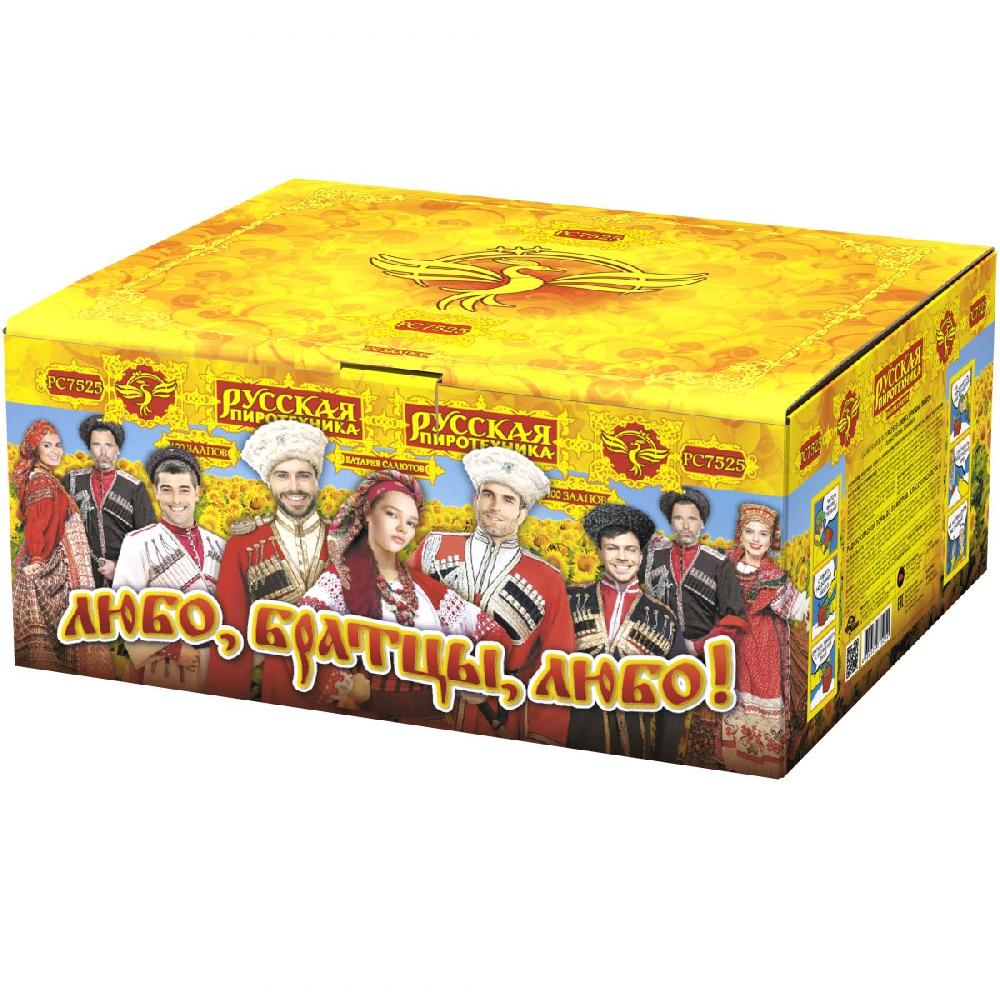 «Любо, братцы, любо!» (РС7525) — это исключительно продолжительный, мощный и очень торжественный салют. Название, отсылающее к казачьей песне, обещает сильное, воодушевляющее и запоминающееся зрелище, полное удали и праздничного размаха. Батарея на 100 залпов с крупным калибром 1,1 дюйма гарантирует очень длительное, высокое и внушительное шоу.