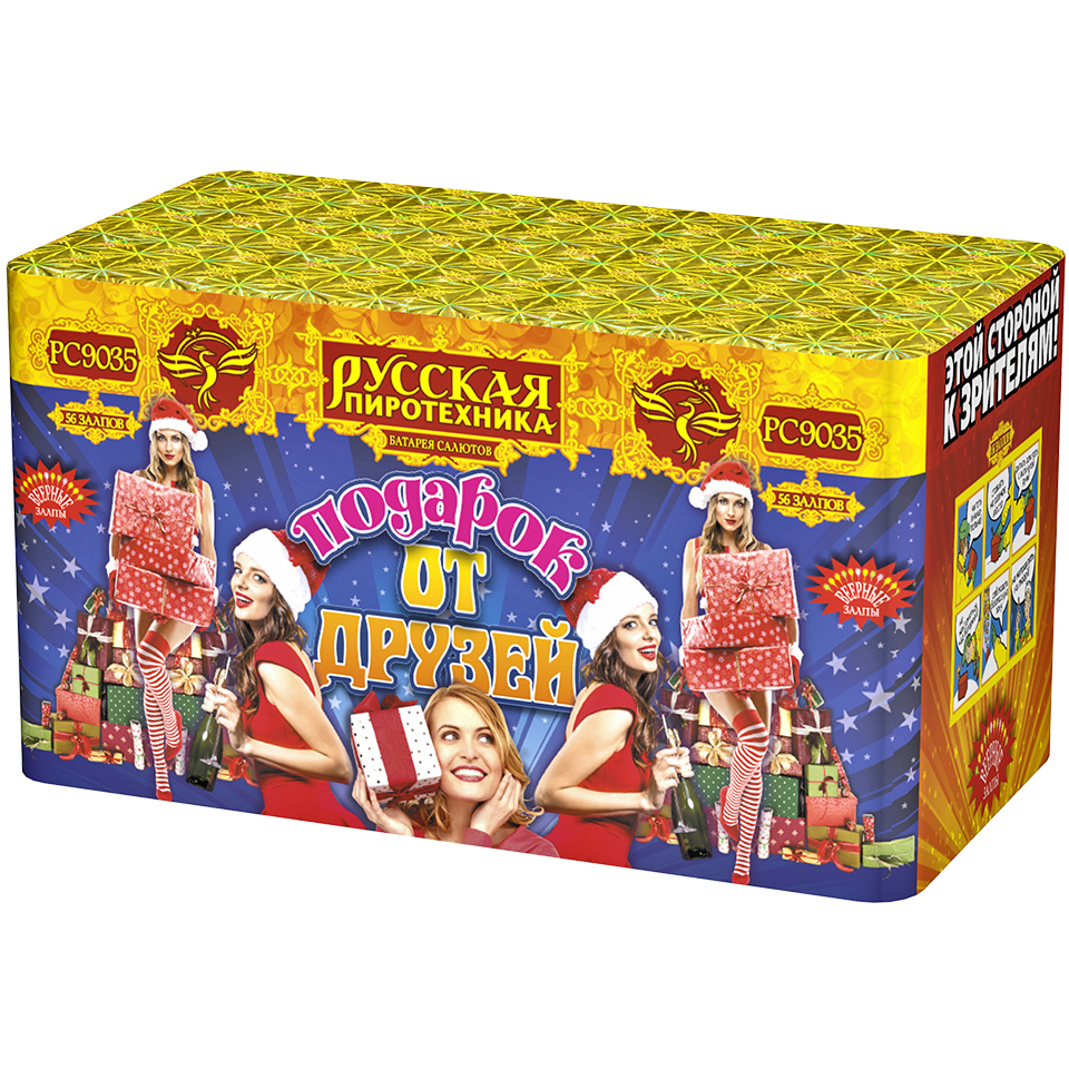 «Подарок от друзей» (РС9035) — это мощный, продолжительный, очень разнообразный и динамичный салют, который является настоящим сюрпризом благодаря сочетанию разных калибров и веерному эффекту. Батарея на 56 залпов представляет собой мультикалибр (0,8", 1,0", 1,2"), что обеспечивает высокую динамику и разнообразный масштаб разрывов.