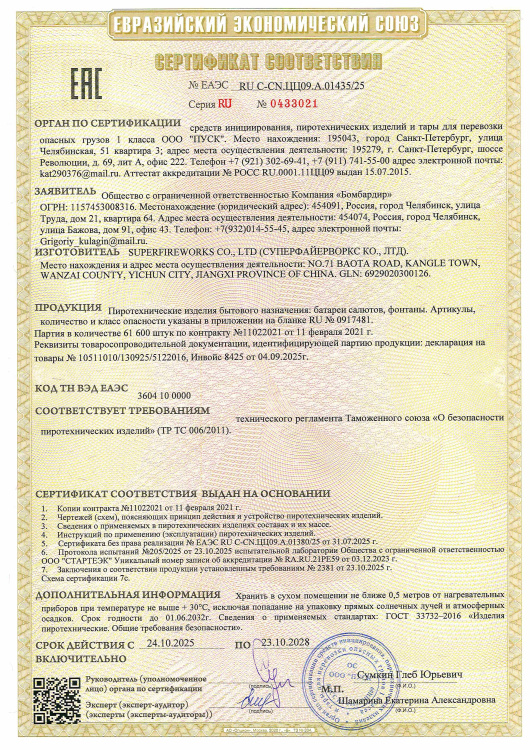 Эффекты: Разноцветные кометы взмывают в ночное небо, раскрываясь в гигантские пионы, переливающиеся красными, синими и золотыми искрами. Залпы сопровождаются динамичным треском и громким финальным аккордом, который закрепит в памяти зрителей, что это действительно «Ждём гостей».