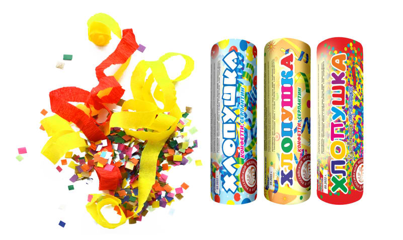 Действие: При повороте основания раздается хлопок (за счет сжатого воздуха), и наполнитель выбрасывается на расстояние 2-5 метров, создавая эффект “дождя” из блесток и лент.