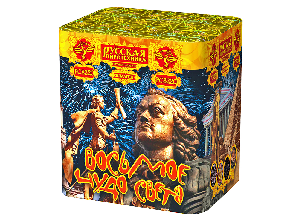 «Восьмое чудо света» (РС8220) — это торжественный, продолжительный и очень мощный салют. Название обещает зрелище невероятного масштаба и красоты. Батарея на 25 залпов с крупным калибром 1,2 дюйма гарантирует внушительные, высокие и громкие разрывы.