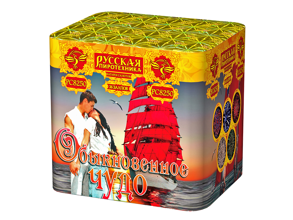 «Обыкновенное чудо» (РС8250) — это торжественный, продолжительный и очень мощный салют. Название ассоциируется со сказкой, волшебством и неожиданной, но прекрасной красотой. Батарея на 36 залпов с крупным калибром 1,2 дюйма гарантирует длительное, высокое и внушительное шоу.