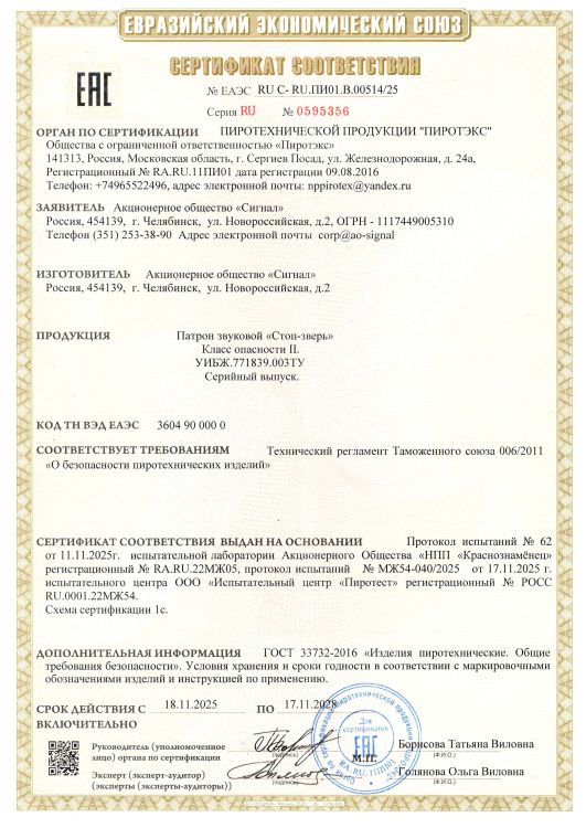 Патрон звуковой резьбовой "Стоп Зверь" 1/100/15