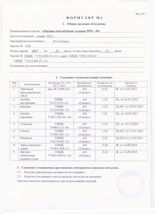 РОЗ-30 Ракета однозвездная зеленого огня (ОАО "Сигнал") 1/90/1
