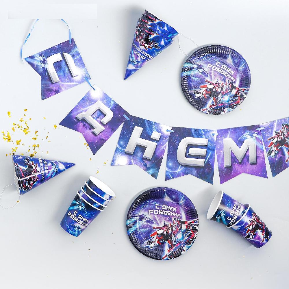 Набор бумажной посуды «С Днём рождения», роботы, 6 тарелок, 6 стаканов, 6 колпаков, 1 гирлянда